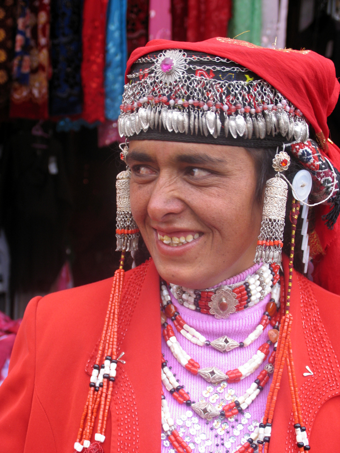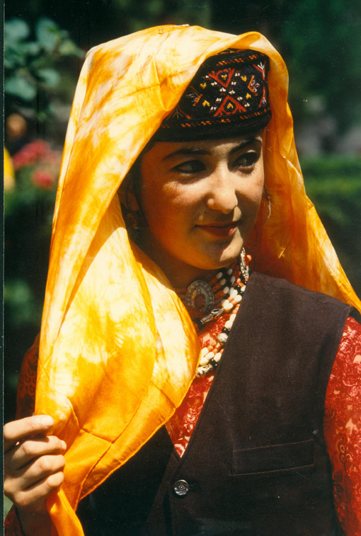 塔吉克族妇女大多肤色白皙,俊俏美丽,喜欢穿着红色的、绣饰花边的大紫、大绿色调的连衣裙。塔吉克族被称为是生活在“云彩上的人家”,妇女不仅美貌动人,而且有一双灵巧的手,她们几乎都精于刺绣,擅长编织。塔吉克族的衣服、帽子、手套、腰带、毛袜、被面、壁挂、花毡、鞍垫等衣帽鞋袜、生活用品上面都会绣有极具有民族特色的图案或花纹,那些都是她们用一针一线精心挑织的各种图案和花卉,这不仅起到了装饰的作用,还丰富、充实了她们的日常生活,这在她们的生活中起到了十分重要作用。她们不仅重视衣物胸前、领口、袖口的装饰,通常还会特意装饰身后,这样使衣物整体看起来都比较协调、美观。衣帽、腰带上都会绣有花纹、图案。女帽的前沿一般都会绣得五彩缤纷,身着盛装时,她们还会在帽檐上还加缀一排小银链,同时佩戴耳环、项链以及各种银质胸饰,美丽的装饰把塔吉克族妇女装扮得如花似玉。