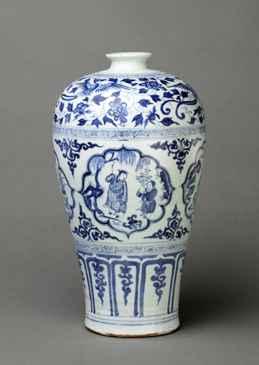 装饰繁密是典型元青花的重要特点,它们由细巧的文化组成若干条带环绕器身,装饰带数量通常很多,但惟独没有7层的,因为这个数字和蒙古族的丧葬与元代的刑罚有关。相反,9层装饰带的元青花却为数不少,而这与蒙古族重九显然有着直接的联系【图为元代后期青花四爱图梅瓶。湖北省博物馆藏】。