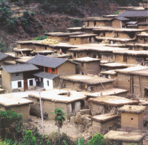 土掌房屋顶 云南楚雄地区的土掌房,是土墙、土顶、外墙和底层无窗的两层楼房。有的内院也盖屋顶,称“无内院式”。设天窗采光,屋顶还能当晒台。整个村落沿山坡而建,巷道很窄,远远望去,你家的屋顶是他家的院坝,只要上了一家屋顶,就能靠活动的木梯自由往来。
