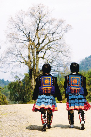 白裤瑶女人身上最惹眼的,除了百褶裙,还有她们衣服背后那一个个大大的方形图案。传说900年前,白裤瑶首领有一方皇帝赐给的权印,被女婿以哄孙子为借口,借走并用假印调了包,瑶族人因此被赶进山里,过起了少田缺水的游耕生活。为了告诫子孙不要忘记因为丧失权力而导致苦难的教训,从此,白裤瑶就在女人的马鞍衣后面,绣上了一个形状像首领印一样的彩色方块图案。这是一种纪念,也是一种怀念。裙摆拂过落叶,一如群蝶穿越花丛。