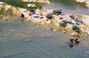 女人在潺潺溪流的大青石上晾好衣裙后,会在溪水中嬉戏