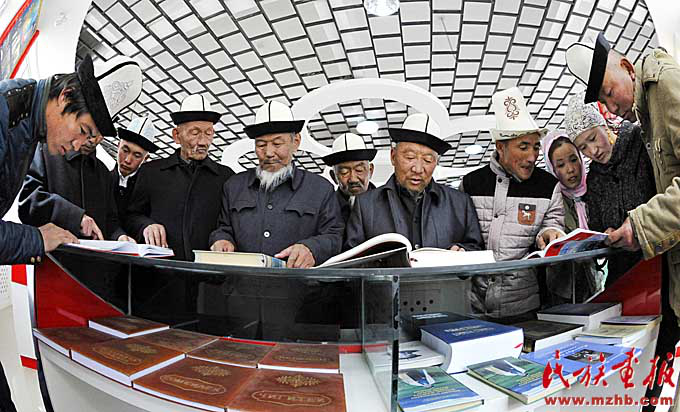 阿合奇县哈拉布拉克乡《玛纳斯》博物馆里,人们在翻阅有关玛纳斯的作品