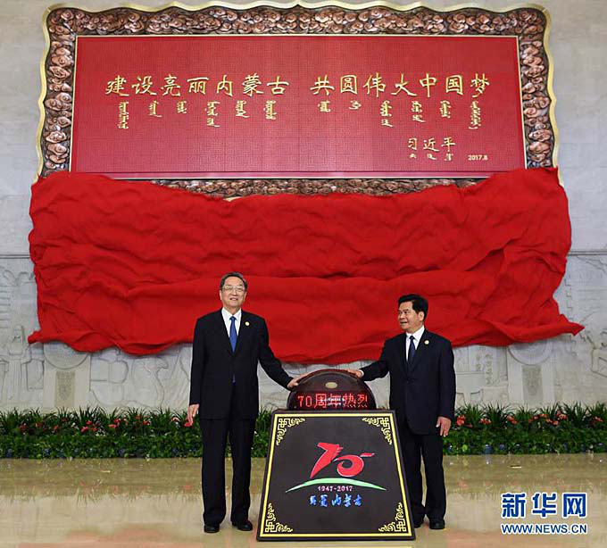 70年来,在党中央高度重视、关心关怀下,内蒙古各族人民在革命、建设和改革的各个历史时期,创造了一个又一个人间奇迹,万里草原发生了翻天覆地的历史巨变。图为8月7日,中共中央政治局常委、全国政协主席、中央代表团团长俞正声率中央代表团出席向内蒙古自治区赠送纪念品仪式,俞正声和内蒙古自治区党委书记、人大常委会主任李纪恒一同为习近平总书记题词贺匾揭幕(新华网)