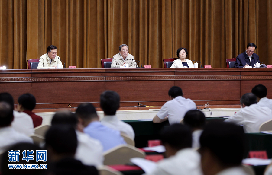 图为7月10日,俞正声出席第六次全国对口支援新疆工作会议第一次全体会议(新华社)