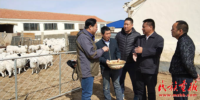 宝力根苏木党委书记青格勒(右2)和牧民研究新型羊饲料