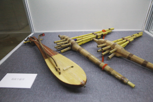 展出的侗族牛腿琴(左)、苗族六管芦笙(中、右)。