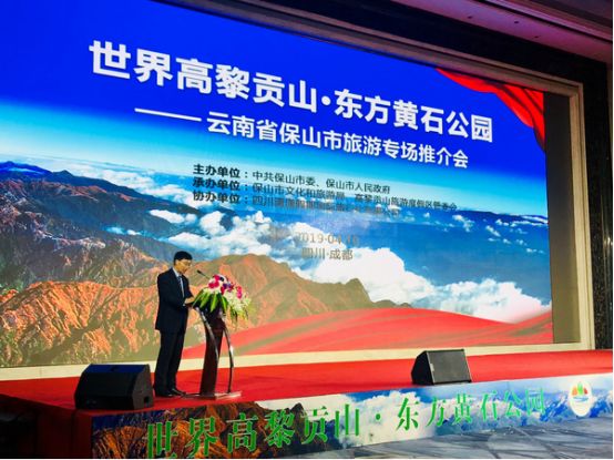 2019年4月10日,“世界高黎贡山·东方黄石公园”保山旅游专场推介会在成都市召开。成都和保山两地旅游界、航空界、新闻界的嘉宾300多人出席推介会。保山市人民政府副市长宋光兴、成都市人民政府副秘书长唐章昭出席推介会并致辞。宋光兴副市长指出,成都素有“天府之国”的美誉,自然风光雄奇险秀,民族风情多姿多彩,巴蜀文化积淀深厚,革命历史可歌可泣,川菜享誉四方,川剧独具魅力,旅游资源得天独厚,是一座传统与现代结合得最好的城市,是“一座来了就不想离开的城市”。高黎贡山作为全球生物多样性最富集的地区,有高等植物4897种,动物2389种,垂直高差达4000多米,几乎分布有中国除沙漠之外的所有陆地气候类型,是国家级自然保护区,是世界公认的地球上最重要的“物种基因库”、是具有国际重要意义的“世界生物圈保护区”,是“三江并流”世界自然遗产的重要组成部分。高黎贡山独特的地质地貌孕育了保山宜人的气候、优良的生态、富集的温泉、秀美的风光、多彩的文化和富饶的物产,使保山成为云南新兴的旅游热点和宜居城市。希望通过这次旅游推介会,能够在成都、保山两地之间架起一座便捷的桥梁,进一步深化两地文化旅游交流合作,共推旅游线路,共拓旅游市场,实现互惠共赢。