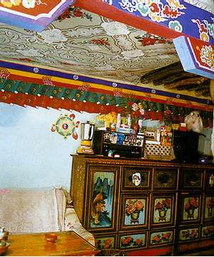 藏族民居室内装饰讲究工整、华丽、亮堂,上至天花板下至与地板相接的墙角都采用雕刻、彩绘等艺术手段加以装点,尤其是横梁、柱头和大门等木结构空间是充分展示装饰才能的地方,在这里装饰效果尽其所能。此外寺庙重点佛堂,回廊墙壁上绘制彩画,这也是一种重要的装饰手段,而百姓居室内的墙壁上用绘制花卉、彩条来取得装饰效果。