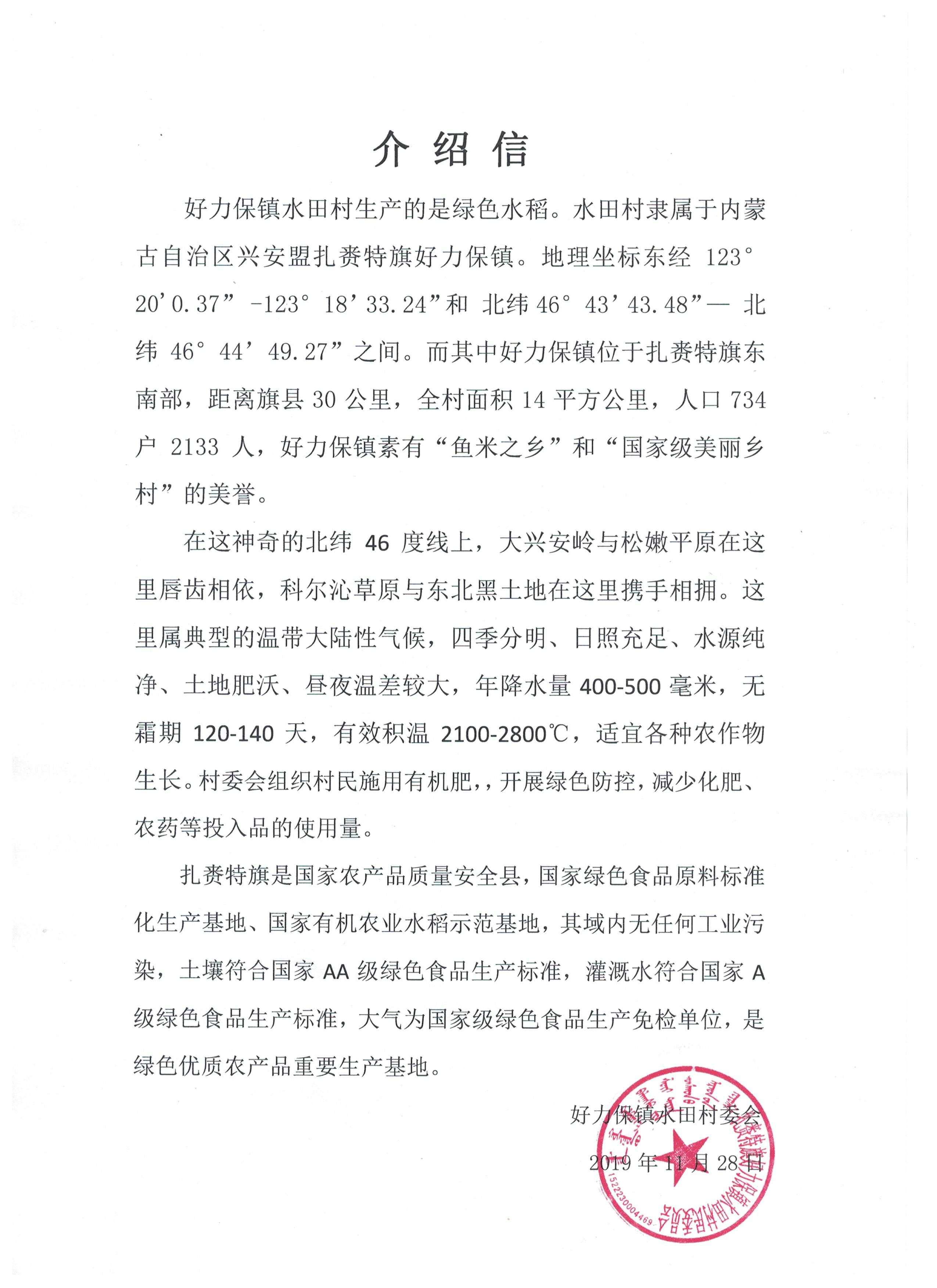 蒙古屯村属好力保镇,沿绰尔河岸而建,水田较多,祖辈种植水稻。蒙古屯村的土壤以黑土为主、土质肥沃,全年积温在2600到2700摄氏度左右、并且早晚温差较大,有利于水稻中有机物的积累。绰尔河水充足时,可以满足沿岸灌溉需求;河水流量较少时,蒙古屯村自有的机井也可以满足种植所需的水量。