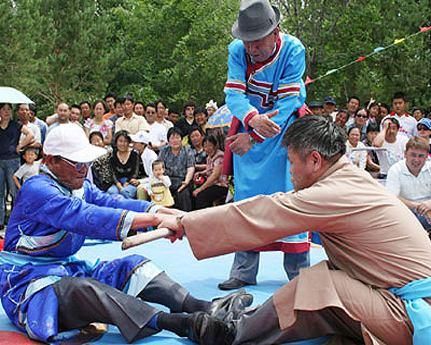 颈力赛和扳棍一样,也是达斡尔族传统的竞技项目之一,在达斡尔族之间十分流行。颈力赛的比赛方式和扳棍相似,比赛双方需要端坐在平地上,蹬直双腿,脚掌相对,双手叉腰或放在腿上,用布腰带套在双方脖颈后部。当裁判员声响后,比赛双方需要互相用脖颈力拉扯对方,哪一方被拉起或屈膝歪倒,就输掉了比赛。