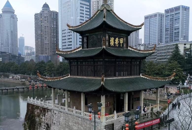 屹立在南明河上的甲秀楼,是繁闹市区中不可多得的清幽之地,景区内古色古香,景区外高楼林立,在现代文明中闪烁着历史的光芒,昂扬着“甲秀天下”的城市精神风貌。