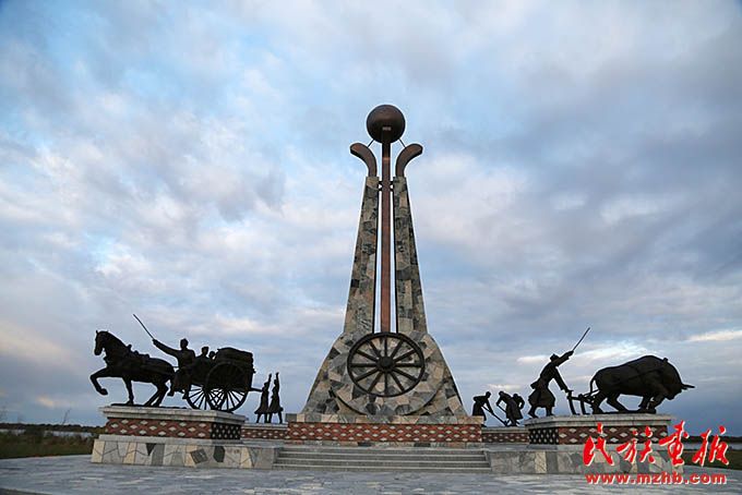 黑河市爱辉区坤河达斡尔族满族乡富拉尔基达斡尔族南迁广场上的雕塑反映了达斡尔族在黑龙江畔开垦土地,建设家园的情景。