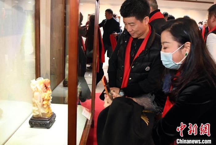 中国工艺美术大师叶子贤寿山石雕传承展吸引观众观看。 记者刘可耕 摄