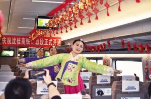 沈佳高铁长白山至敦化段开通运营,将促进沿线旅游业和冰雪经济快速发展,进一步加强民族团结,助力长吉图开发开放、深度融入 “一带一路”。图为列车工作人员在车内表演朝鲜族歌舞。 新华社发