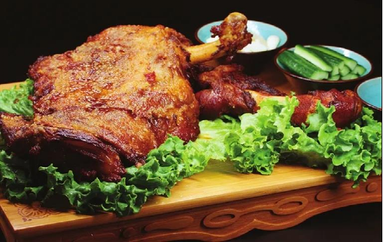烤羊腿:将绵羊带骨前后腿肉,配上葱头、芹菜和其他调料烤制而成,外酥里嫩,味道鲜美。食用时佐以黄酱、葱段和荷页饼食之。