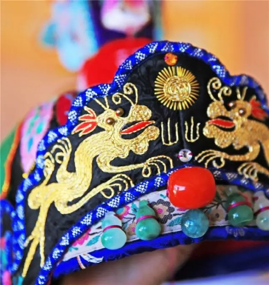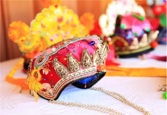 走进杨文焕的工作室,犹如进入一个明媚鲜艳的梦境。首先映入眼帘的,便是那一顶顶色彩鲜艳、绣工精致的童帽:造型大方、线条流畅的狮子帽;色彩明艳、虎虎生威的老虎帽;精巧别致、活泼可爱的翘尾帽;高雅富丽、古韵悠长的公子帽;别具一格、特色鲜明的牌坊帽。