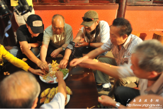 西行音乐公路之旅行至广南,当地企业为让旅行团队充分了解广南的饮食文化及人文风俗,经过多方走访,把广南土司后代、地主大户后代等曾经享受过土司盛宴的老人集在一起,共同研究,精心准备,聘请当地名厨,制作出消失48年之久的土司盛宴——“三滴水”。