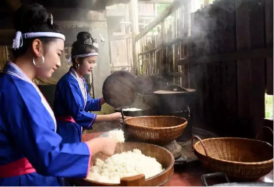 两名姑娘在蒸糯米饭