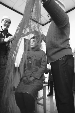 新娘出发前,在头上蒙上一块红纱