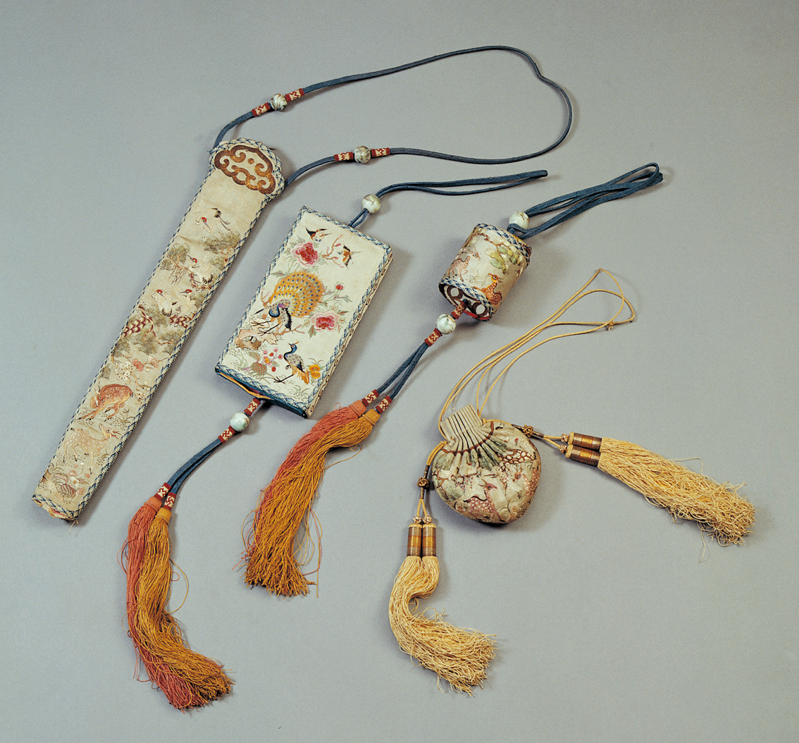 满族服饰色彩多以淡雅的白色、蓝紫色为主,红、粉、淡黄、黑等色也是其服饰的常用色。白色在满族服饰中是一个重要的颜色,因为,满族传统上有尚白习俗,以白色为洁、为贵,白色象征着吉祥如意,所以,在满族服饰中常在红色、蓝色等其他颜色的旗袍上镶白色的花边。满族男女都喜爱在腰间或衣服的大襟上挂佩饰。男子有火镰、耳勺、牙签、眼镜盒、扇带。满族女子喜欢盘头翅,梳两把头或旗髻,戴耳环、手镯、戒指、头簪、大绒花和鬓花等各种装饰品。擅长刺绣,她们在衣襟、鞋面、香囊、荷包、枕头等物品上刺绣花卉、芳草、鹤鹿、龙凤等吉祥图案(图为满族清代绣花湖色缎佩饰,中央民族大学民族博物馆馆藏)。