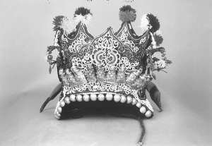 绣花帽由里外两部分组成,素有“制做绣花帽,先做好衬套”之说。即先按儿童头径大小制衬套,做法较简单,用染过的家织布做里衬,铺上薄棉,外层为红绸面,用线依次纳紧,以防棉花下滑,缝成筒状后,顶部用同样的材料剪成四方形,与上部帽沿结构相同即成。后部分较前部分复杂,先将染过的两层家织布粘牢,表面贴上各色缎面,颜色自定。把图样拓在缎面上,剪下形状不同的6片材料,把喜爱的图案描绘在上面,接着用纺车纺出6根各4米长的棉线,用吊砣逐根旋转缠绕白色呢绒线,经浓缩,每根仅得到1米左右线料,将这制好的精线按图案盘弄,后以花针固定,再辅以其他色线刺绣成图案点缀其间。把绣好的6片材料组合到衬套上,各片边沿用黑白两色线交替锁边,帽口用黑金绒布滚边。此时,帽顶的6只尖角用彩色毛线制做成圆球装饰,外面四角下面悬吊白色珍珠串,末端垂着布制五角星。帽的周边钉上银制品,最后镶上反光小圆点饰物似天上星星般光亮,给本就精致美观的绣花帽增添了一道靓丽色彩,绣花帽就这样在侗家女的手中诞生了。