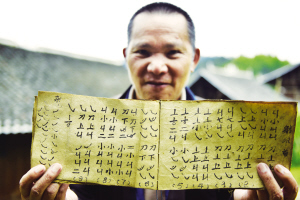 图为仁吉侗寨村民吴昌贤在展示祖辈流传下来的古老芦笙曲谱。  吴国桢 摄影报道