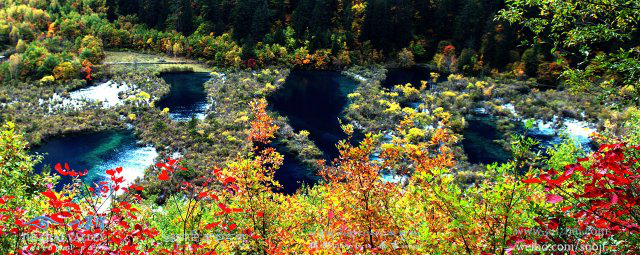 九寨沟位于四川省西北部岷山山脉南段的阿坝藏族羌族自治州九寨沟县漳扎镇境内,年均气温6—14℃度,冬无严寒,夏季凉爽,四季景色各异:仲春树绿花艳,盛夏幽湖翠山,金秋尽染山林,隆冬冰塑自然。以翠湖、叠瀑、彩林、雪峰、藏情、蓝冰“六绝”著称于世。