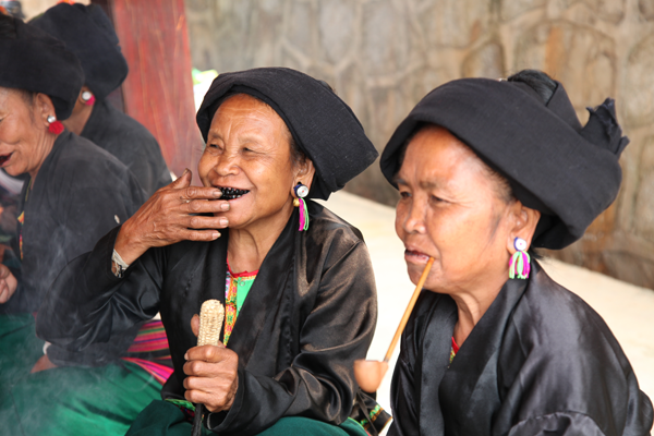 妇女的衣裙与傣族相似,上穿紧身短衣,头顶挽髻,用头巾缠头,喜欢戴大耳环、银手镯等装饰。姑娘爱戴野花或自编的彩花,将双颊染红。一般,女子上着左右两祚斜襟窄袖黑色小褂,小褂为圆领、紧腰、宽摆,短及臀部,在左肋下拴线打结,已婚妇女用黑色布料,未婚姑娘喜浅蓝色或白色。里衫为无袖贴身夹衫,下穿两条筒裙,内裙为白色,外裙有两色,臀部以上为红色横条,腿下为绿色或黑色,用布条或花边镶饰。未婚妇女用黑或蓝布包头;已婚妇女梳发髻,插银簪,顶端镶3颗棱形玻璃珠,下系银链,缠包头。妇女戴银耳环、项圈、手镯等饰品。