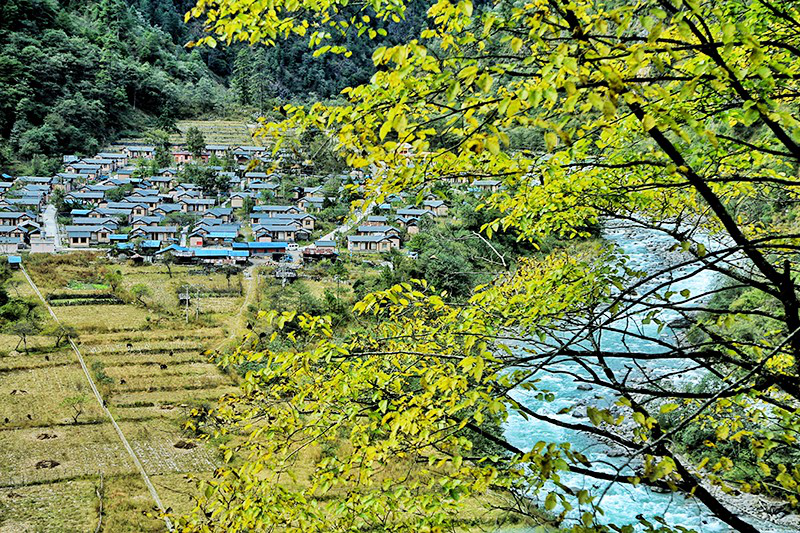 熊当村远眺。熊当村是独龙江乡最北的村子,与西藏接壤,如今已完成了安居重建