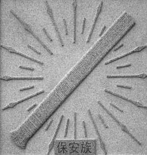 保安族擅长打刀技术,所产刀具构造精巧、质量上乘,工艺独成一体,被称为“保安腰刀”。保安人打制腰刀具有800多年的历史,公元13世纪成吉思汗东征时,把部分来自中亚的官兵和工匠留在青海同仁地区。这部分色目人与当地蒙古、汉、回、藏、土等民族相邻而居,相互交流融合,逐步形成了今天的保安民族。保安族发挥擅长冶铁技术的特长,所生产的腰刀不仅自用,还成为与蒙古、藏、回等民族交换牛羊和日用品的商品,因此逐渐闻名于世。