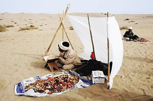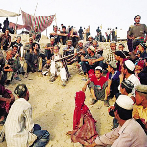 2004年6月,和田市和田县库克马日暮麻扎,民间艺人在表演说唱