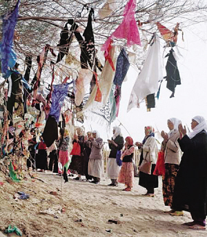 在新疆,尤其是在维吾尔族聚居的南疆,普遍存在类似内地庙会式的麻扎朝拜活动。朝拜者面向麻扎倾诉心中的哀怨痛苦,以各种方式表达自己的祈求:有向麻扎求消灾避祸的,有求富贵发财的,还有求夫妻和睦的,求理想伴侣的,求生儿育女的,求老有所养的,求天降甘霖的……