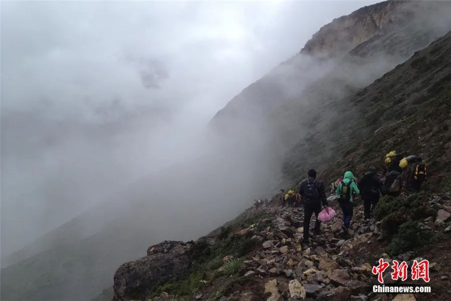 2013年,工作人员在日喀则茹村进行古籍普查。山洪暴发冲毁道路,大家走在山间的乱石上。受访者供图