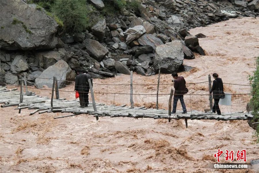 2014年,工作人员赴那曲比如县进行古籍普查,经过怒江上一座简易浮桥。受访者供图。
