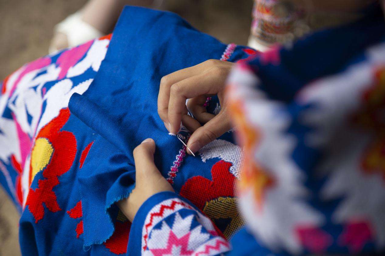 苗族的传统服饰出自本民族妇女的双手,服饰中的刺绣是制作工序当中最为复杂的一项。闲暇时分,苗族妇女三五成群,坐着故居前,伴着习习凉风刺绣。刺绣图案的多少和优美与否,在一定程度上,标识了苗族妇女的勤劳能干,所以坝楼村苗族妇女的刺绣图案复杂多变,集优美与实用一体。刺绣是苗族源远流长的手工艺术,是苗族服饰主要的装饰手段,是苗族女性文化的代表。苗族刺绣借助色彩的运用、图案的搭配,达到视觉上的多维空间。其中挑花也称数纱绣,是苗族特有的技艺,不事先取样,利用布的经纬线挑绣,反挑正取,形成各种几何纹样。