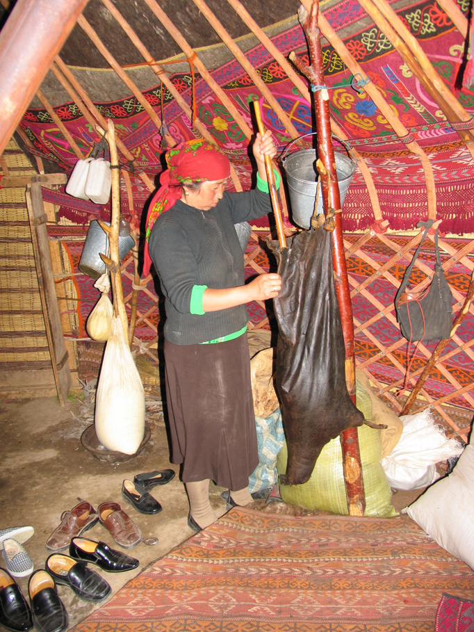 捣酸奶的柯尔克孜妇女(刘军摄)