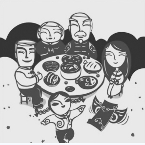 终于,日影西斜,公鸡肉和猪脚都已炖好,煎炸炒煮的各色菜肴一一准备妥当。我奶奶使人放上半封炮仗,用最干净的碗盛上三半碗饭,上面搛上各种肉食,从楼上取下我木匠爷爷留下来的红漆小盘端上,碗旁各放一双筷子,一祭天地,二祭山神,三祭井神,四祭灶君,五祭祖先,祈求诸神保佑一家来年风调雨顺、家畜兴旺、阖家幸福平安。待一一地全都祭过了,年夜饭才暖融融、香滋滋地开场。一家人团团圆圆围桌而坐,温馨而热闹,一年里的劳苦和艰辛,在这时全都化作了一团祥和,一团温暖。
