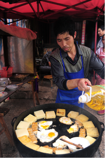 平坝的小吃,每一处都是风景。到天气炎热时,豌豆粉摊,煎了吃,还要凉拌着吃,吃到仅剩汤汁时,加上一点冷饭、拌匀而食,又是一番风味。