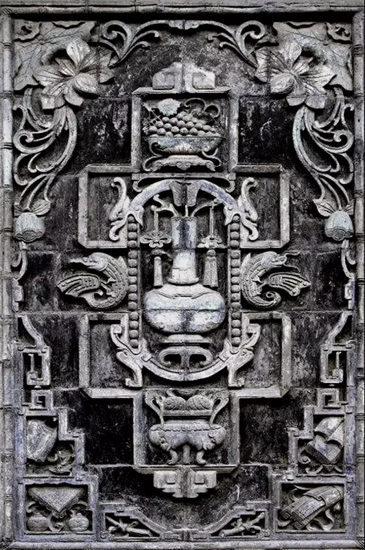 砖雕指在青砖上雕出山水、花卉、人物等图案,是古建筑雕刻中很重要的一种艺术形式。