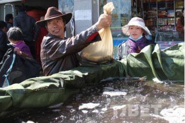 在当地药王山农贸市场可以看到,很多信众或带着器皿或拿着塑料口袋前往水产店买鱼放生。甚至有的信众开着一辆面包车,车厢用塑料包裹,里面装满水,载着买来的一整车鱼前往拉萨河放生。 “萨嘎达瓦节期间,鱼卖的特别快,藏历十五的时候我们的鱼都被买光了。”水产市场的李老板说。