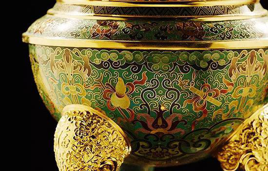 此时的景泰蓝不仅继承了明代豪华、古典、雅致的民族风格,而且镀金技术更为发达,器物表面多饰以珍贵宝石,镀金厚重光亮,宝石灿烂夺目,二者相得益彰,充分体现了皇家的雍容气派。