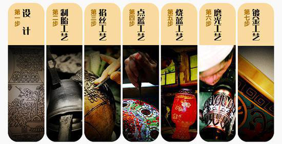 一件景泰蓝成品需要历经设计、制胎、掐丝、点蓝、烧蓝、磨光、镀金七大步骤,近百道工序,十几个工匠三个月的时间纯手工方能完成。景泰蓝既运用了青铜工艺,又吸收了瓷器工艺,同时大量引进传统绘画和雕刻技艺,是集冶金、铸造、绘画、窑业、雕、錾、锤等多种工艺为一体的复合性工艺过程,堪称集中国传统工艺之大成,因而自古便有“一件景泰蓝,十箱官窑器”之说。
