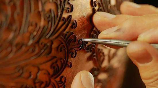 铜胎制成后,还要在胎上“画图”,只是这画图的工具不是笔,而是极富延展性的铜丝。这是景泰蓝制作的第二道工序:掐丝。师傅们先将设计好的图样画到铜胎上,再将铜丝按照图案掰出各种曲线,然后用镊子夹着折好的铜丝,沾上点儿白芨,严丝合缝地粘在铜胎的图案上。