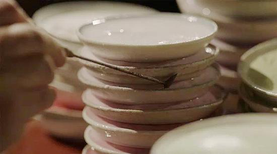 在每一个点蓝的师傅面前,都由低到高排着一摞白色小碟,里面是掺了水的釉料。细看去,同样是紫色,但从深紫到浅紫,竟然能分出十多种层次来。制作精良的景泰蓝作品,对点蓝要求很高。一片花瓣,要描绘颜色的渐变,就要由深入浅润染几个层次,才能表现出花朵特有的美感——这也是景泰蓝的魅力所在,如果一朵花瓣只涂一二种颜色,功夫省了,景泰蓝之美也消失了。