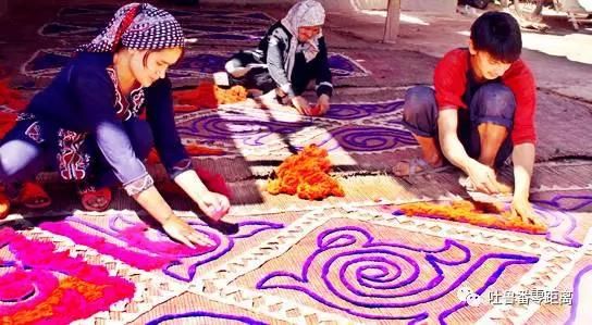 试想,一处古老的维吾尔族院落里,土质的院墙和房子将一家人聚拢在一起,走进这家人的客厅,整洁而舒适,印花布的身影随处可见:长条形的蓝色印花布作为床围; 一张方形的印花布被铺在桌子上 与餐盘、茶具相互映衬, 恬静和谐; 坐垫套、窗帘…… 印花布的身影无处不在,点点滴滴地点缀着这家居室,也将女主人的心灵手巧表现得淋漓尽致。 这是怎样一幅远古家庭的生活场景啊?