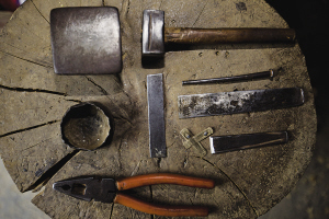 制芦笙的几个关键技术活——安簧片、点铅、校音等工序,得由杨枝光亲自上。他从工具箱里翻出一只薄薄的铜片,先是凑近看了看,中指轻弹了铜片后把它放到耳朵边听,似乎觉得声音不太悦耳,于是又把铜片放在砧上用铁锤敲打,再看、再弹、再听……反复四五遍后,他总算满意了,这才把铜片粘在笙管底端开口处。装入簧片,芦笙才算安装好。