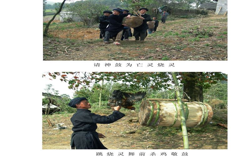 据苗族民间传说,杨鲁(指苗族祖先)死后,为祭奠他,苗族人民就用杨鲁从玉皇大帝那里带回来的木鼓和芦笙为他做斋,鸣鼓三声,吹奏芦笙震天动地,接杨鲁回来烧灵,因此鼓和芦笙成为苗族人民办丧事的信物,是神灵的象征,以鼓配唱,以鼓配笙吹跳,久而久之形成了苗族祭祀祖先和为亡灵烧灵开道的祭祀性舞蹈——“烧灵舞”。远古时期,苗族是比较强大的民族,苗族的丧葬习俗,一直受着鬼神观念的影响,并在意识形态深处,打下了深刻的烙印。由此可知,苗族“烧灵舞”源远流长,以口传心授方式代代相传。