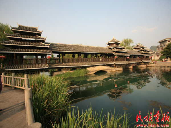 诗人郭沫若先生虽然没有到过柳州的三江侗乡,但看完一幅程阳桥的图片后,竟也引发了如潮的诗思,欣然写下了一首七律:“艳说林溪风雨桥,桥长廿丈四寻高。重瓴联阁怡神巧,列砥横流入望遥。竹木一身坚胜铁,茶林万载茁新苗。何时得上三江道,学把犁锄事体劳。”