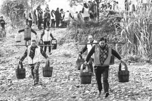 日前,湖北省秭归县举办了以“促进民族团结 助力乡村振兴”为主题的少数民族农民运动会,14个村组队参加了“背财富(挑水)”“掰金现银致富快(扭苞谷)”“双手捏出幸福来(包饺子)”等极具土家族民俗特色的比赛。图为村民在参加“背财富”比赛。